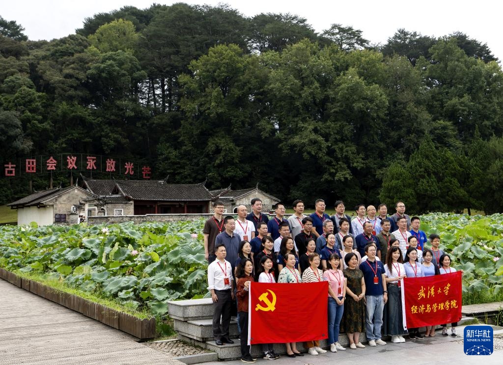 8月29日,来自武汉大学经济与管理学院的培训团队在古田会议会址前合影。