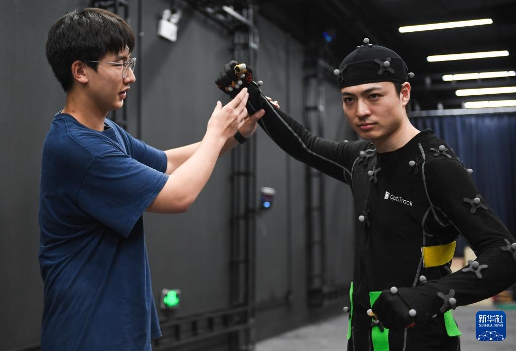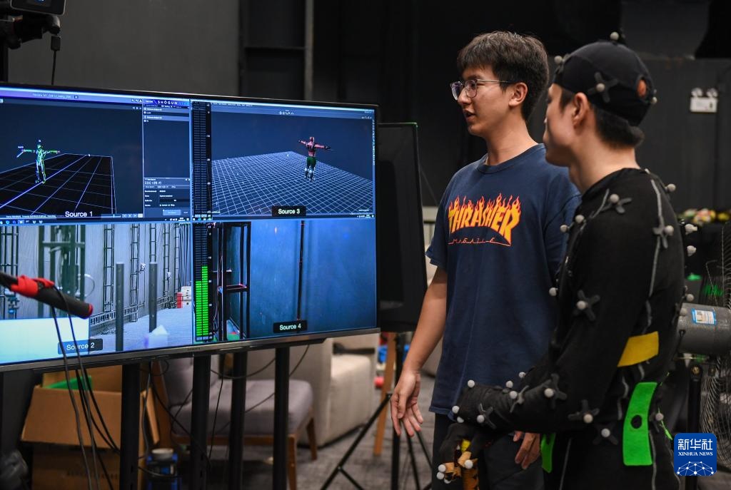 8月28日,在深圳的一个动捕基地,动作捕捉师对殷凯(左)的表演进行指导。