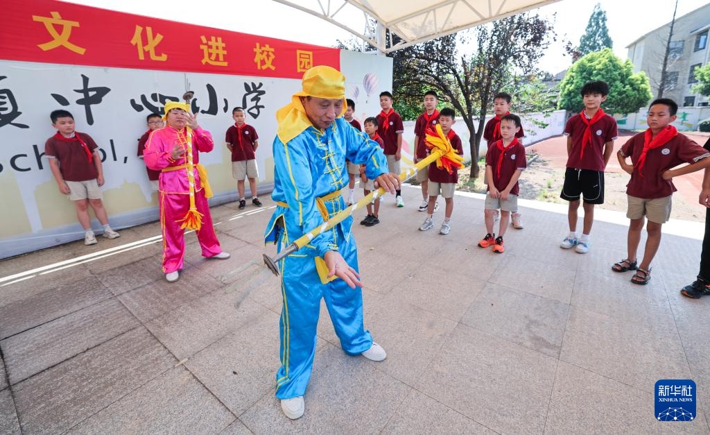 8月30日,响叉非遗传承人向安华镇中心学校的学生们展示技艺,并指导学生练习响叉。