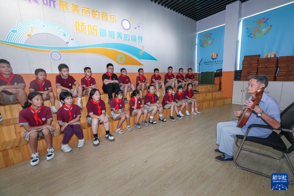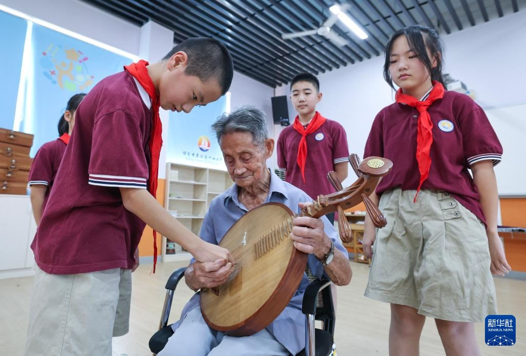 8月30日,95岁的摊簧技艺传承人周才高向安华镇中心学校的学生们介绍摊簧演奏乐器。