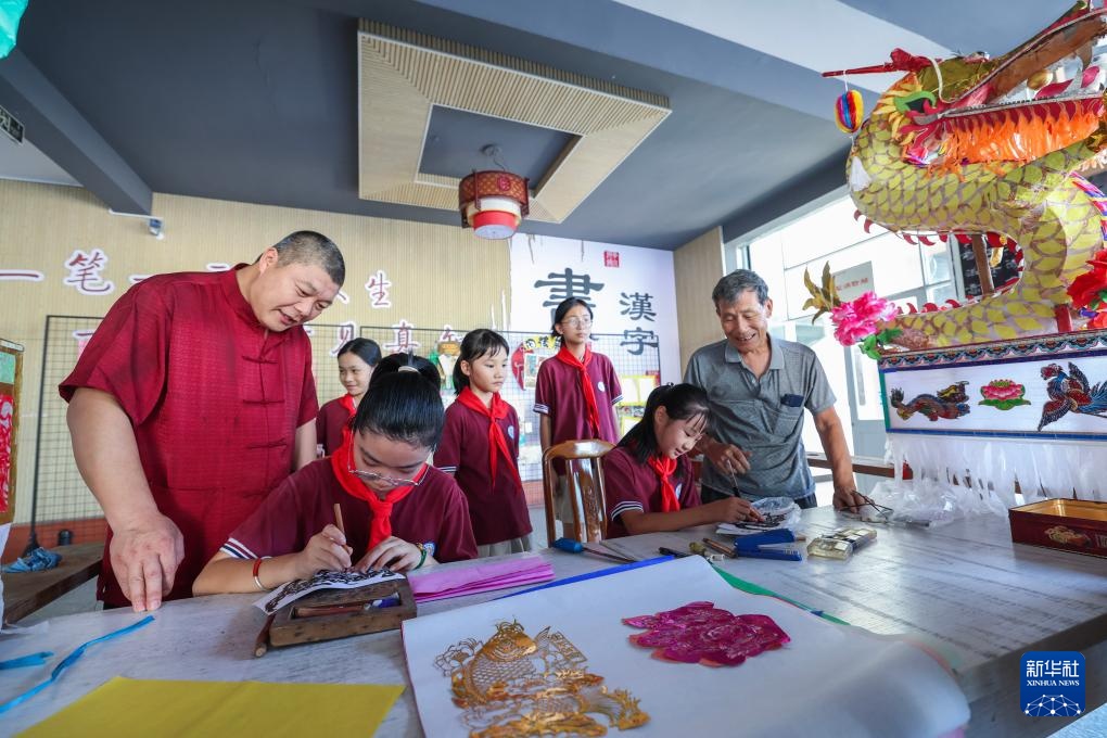 8月30日,安华镇中心学校的学生们在学习传统剪纸技艺。