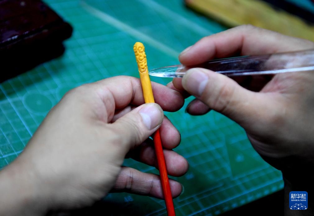 8月27日,河南省洛阳市古玩城一间工作室里,宋展克正在制作金箍棒。