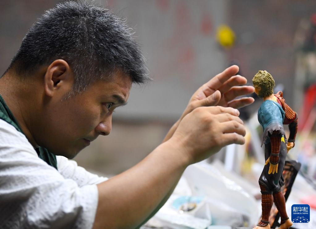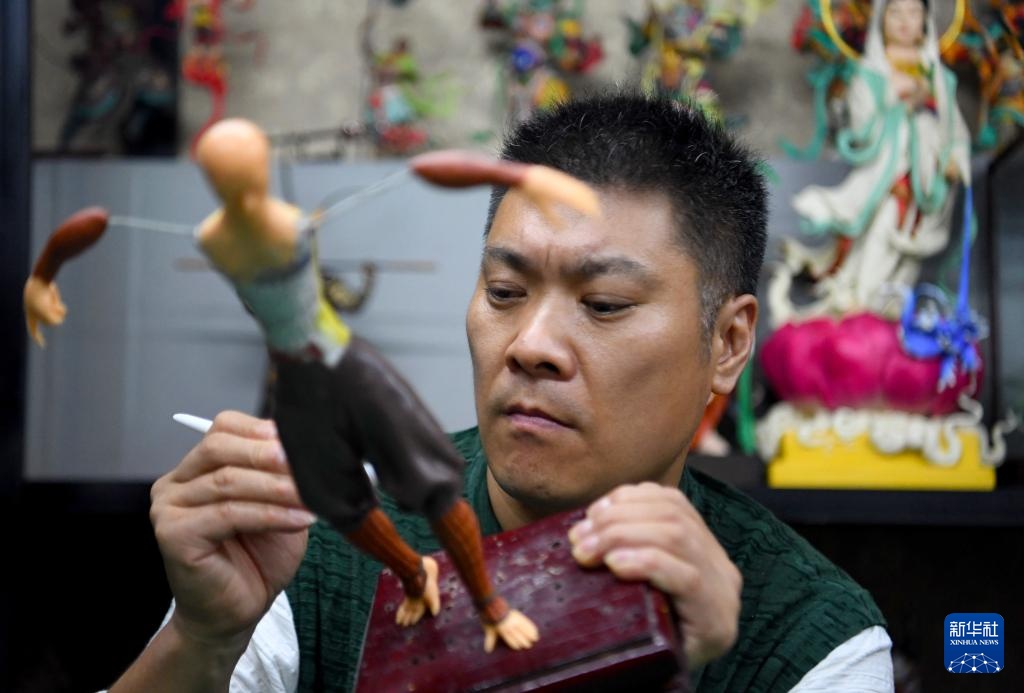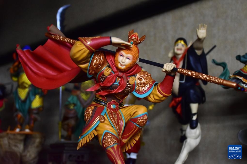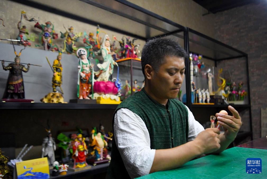 8月27日,河南省洛阳市古玩城一间工作室里,宋展克正在制作“悟空”面塑。