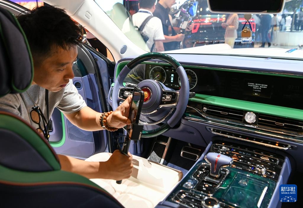 8月30日,在第二十七届成都国际汽车展览会红旗金葵花品牌展台,参观者在拍摄红旗国礼内饰。