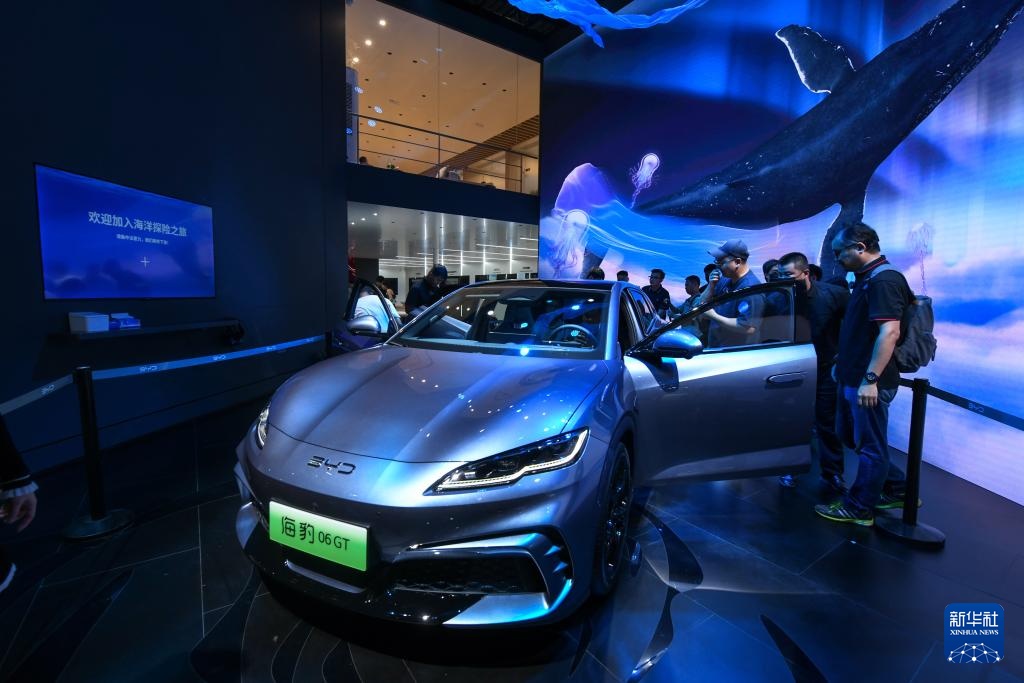 8月30日,在第二十七届成都国际汽车展览会比亚迪展馆,参观者在了解新发布的比亚迪海豹06GT。