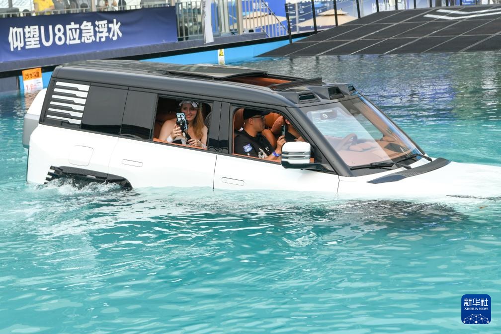 8月30日,在第二十七届成都国际汽车展览会室外汽车技术展示区,参观者在仰望U8应急浮水测试中拍摄。