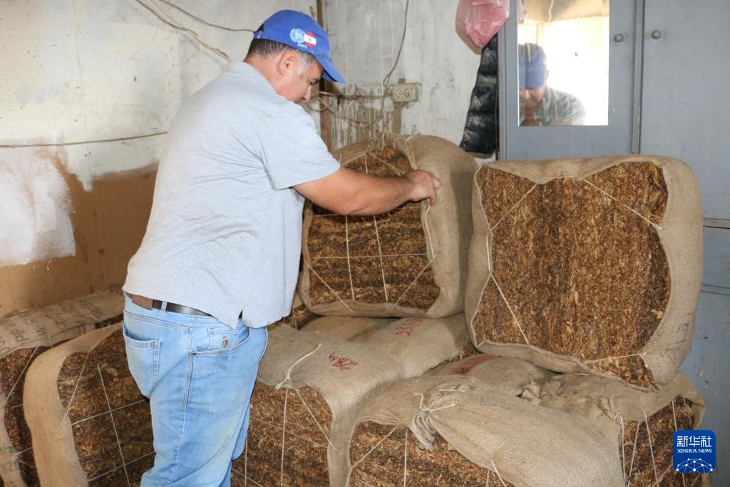 8月27日,在黎巴嫩南部的克莱亚村,一名男子整理收获的烟草。
