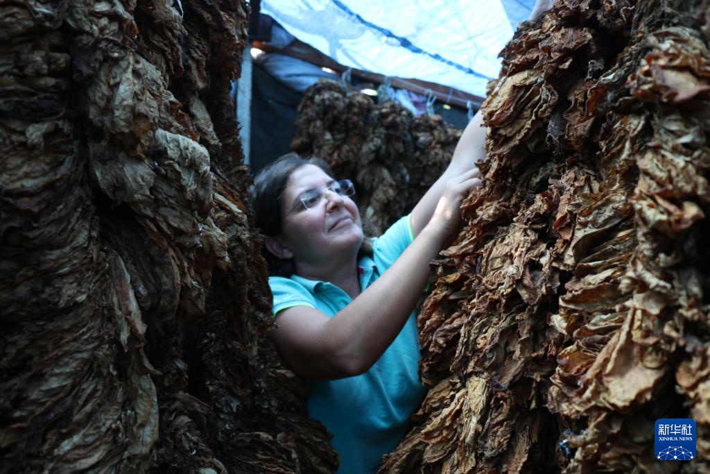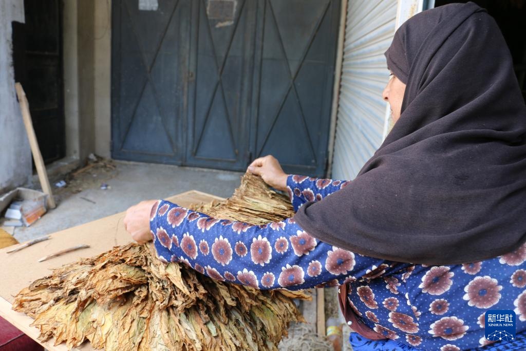 8月27日,在黎巴嫩南部的克莱亚村,一名女子整理收获的烟草。