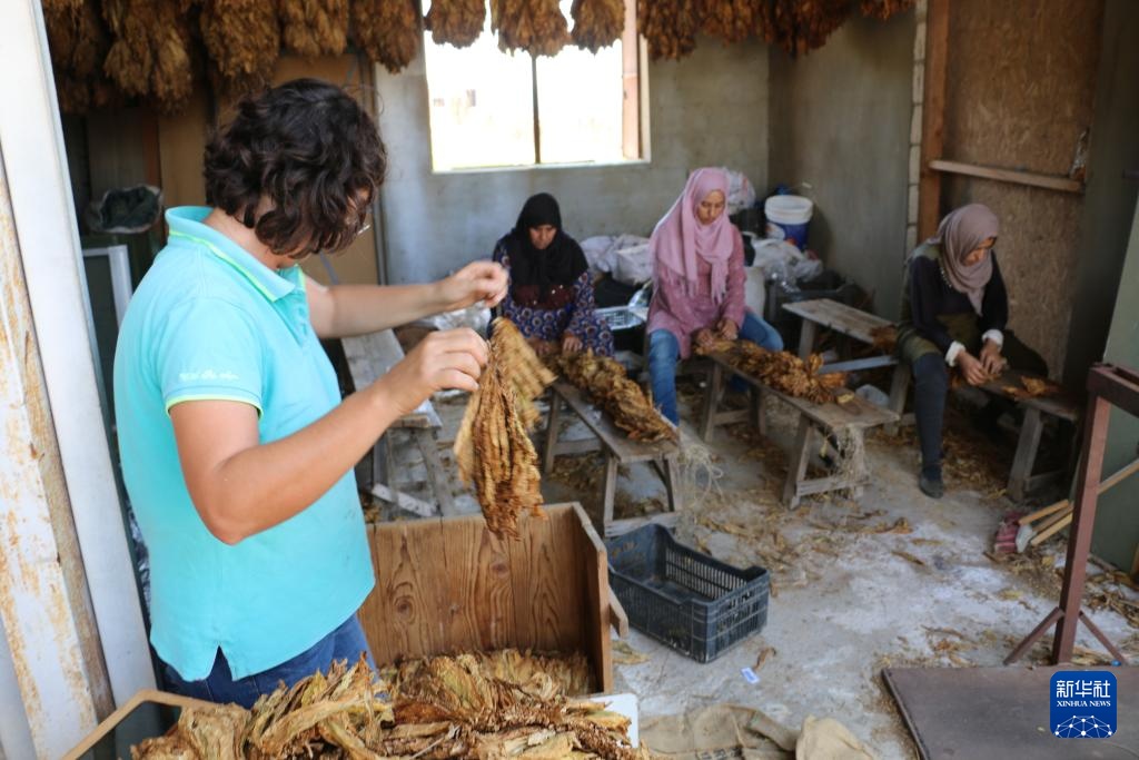 8月27日,在黎巴嫩南部的克莱亚村,人们整理收获的烟草。