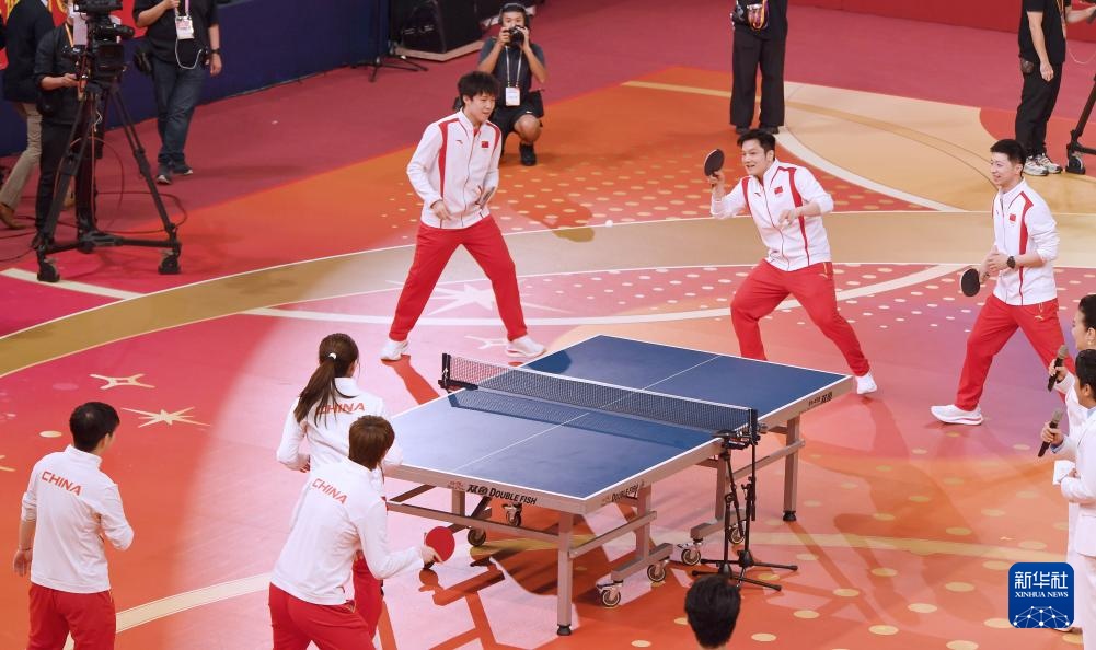 8月30日,乒乓球队六位冠军选手进行乒乓球表演。