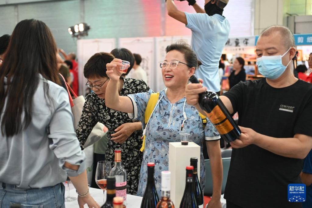 8月30日,参观者在养老服务业博览会上品尝红酒。