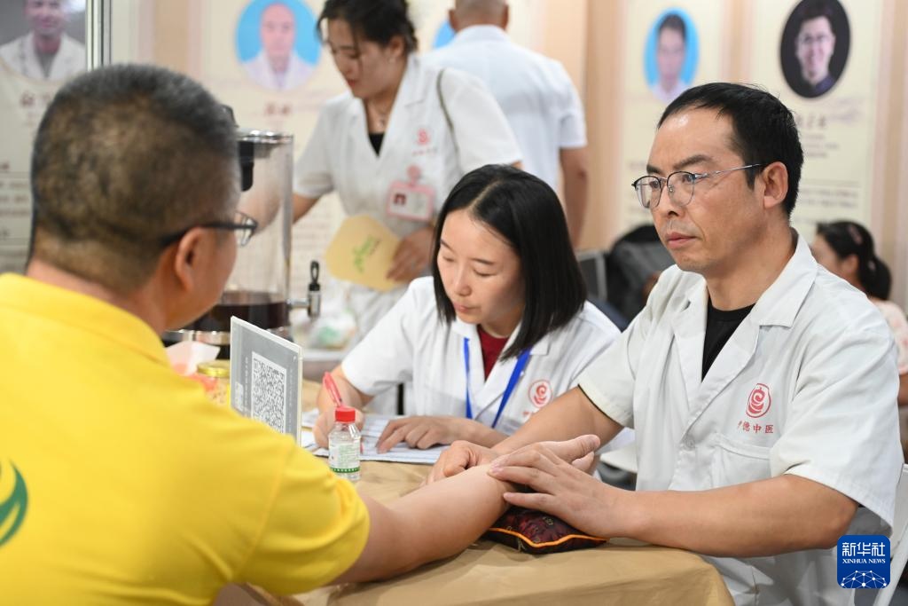 8月30日,工作人员在养老服务业博览会上为参观者义诊。