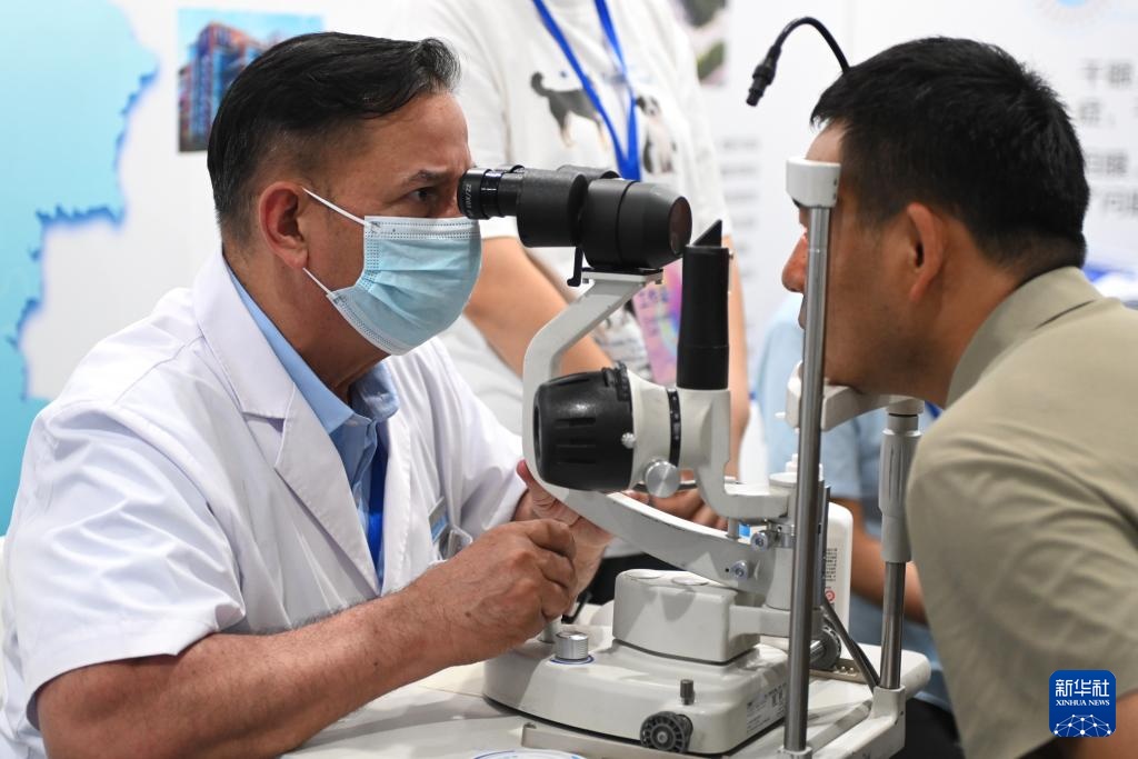8月30日,工作人员在养老服务业博览会上为参观者做眼部检查。