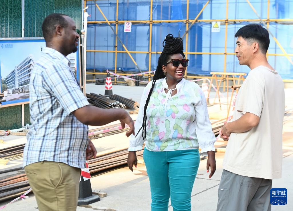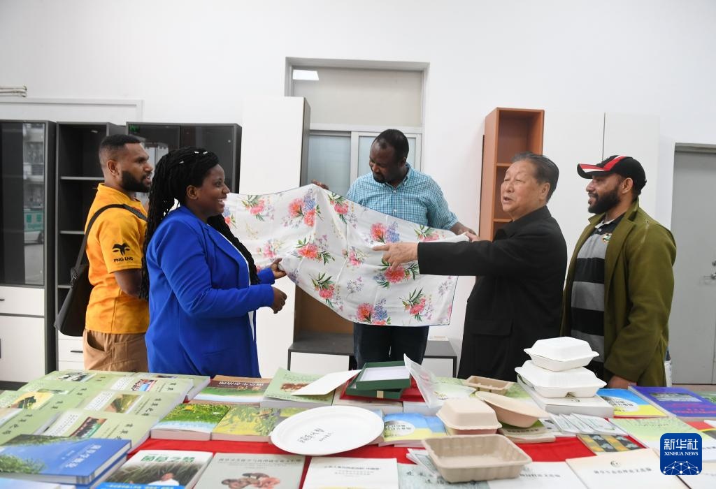 马文博(左)和妻子梅迪(中)在福建农林大学与曾经是福建农林大学国家菌草技术研究中心驻卢旺达的菌草科研人员胡应平交谈(8月30日摄)。