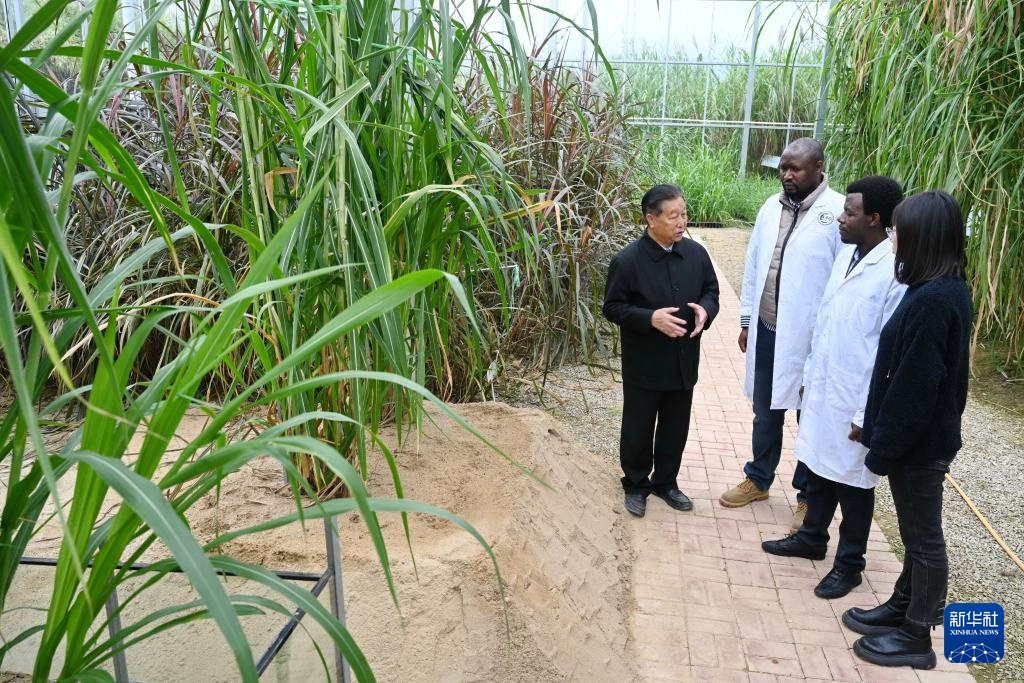 林占熺(左一)在国家菌草工程技术研究中心菌草种质资源圃给马文博(左二)等外国留学生讲解菌草的种植培育技术(2021年11月23日摄)。