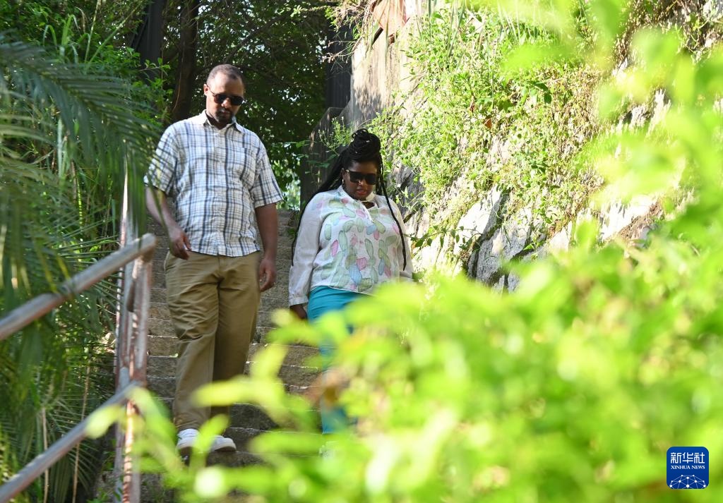 马文博(左)和妻子梅迪在福建农林大学国际菌草苑观察菌草的生长态势(8月30日摄)。