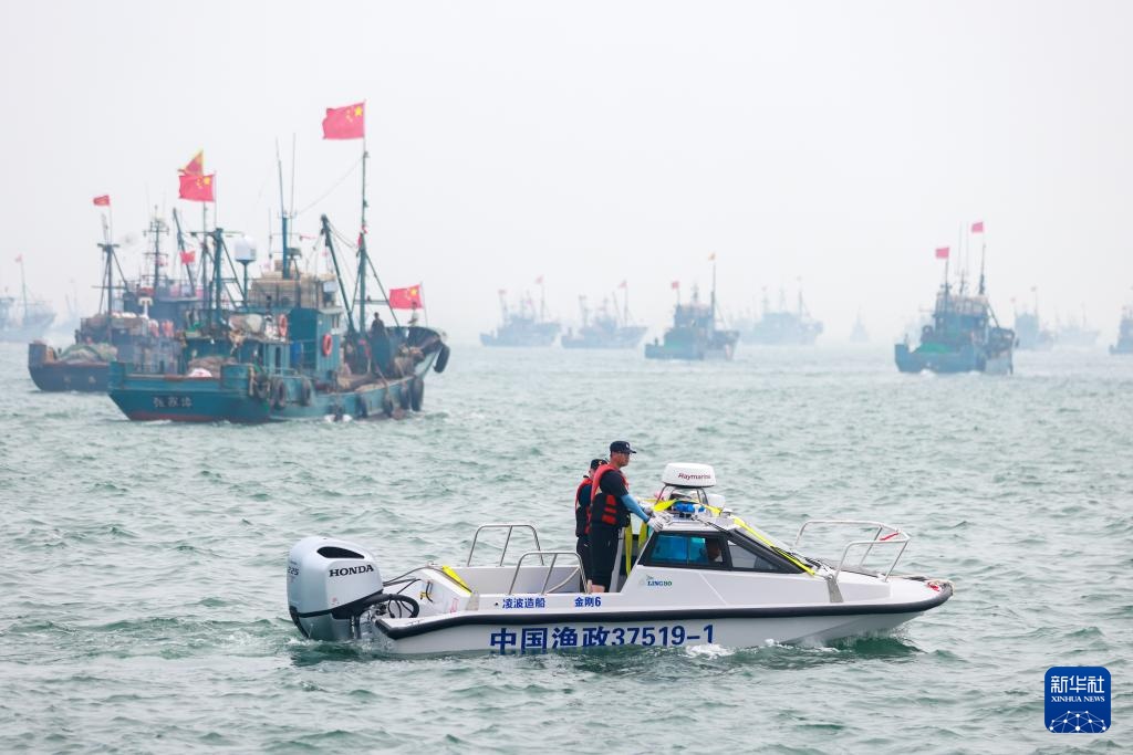9月1日,在山东省荣成市石岛渔港,渔政执法人员驾驶快艇伴航出海渔船。