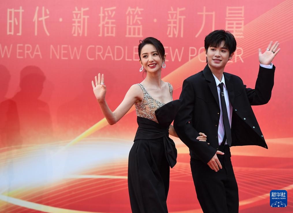 9月1日,佟丽娅(左)、黄明昊亮相长春电影节闭幕式红毯。