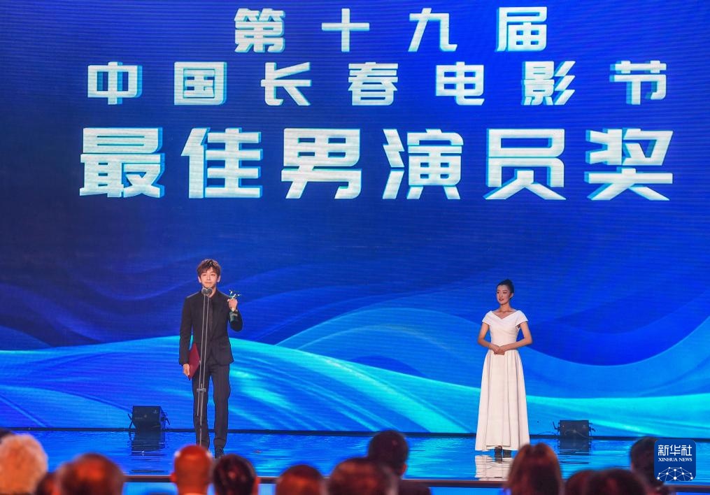 9月1日,彭昱畅(左)发表获奖感言,他凭借《我们一起摇太阳》获得金鹿奖最佳男演员奖。