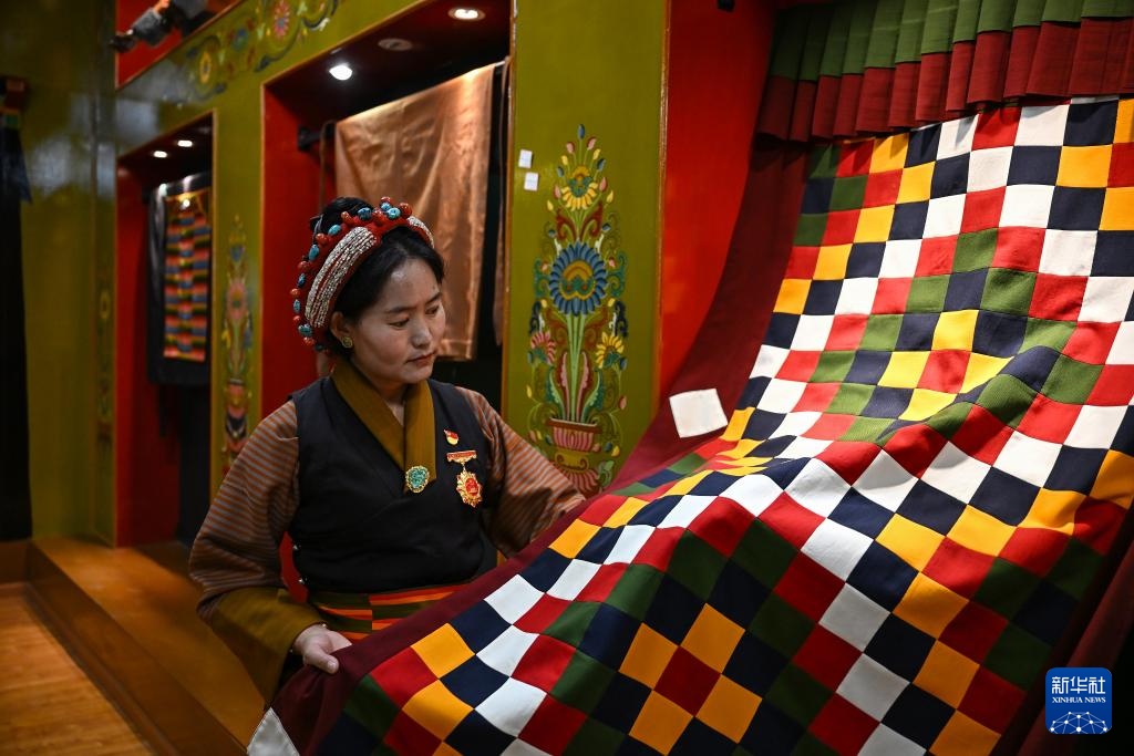9月1日,在西藏日喀则市仁布县特色产业孵化园,亚德细褐纺织手工艺传承人南木珍查看展示的纺织品成品。