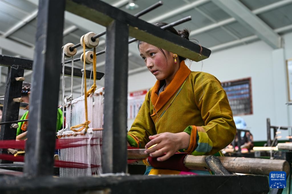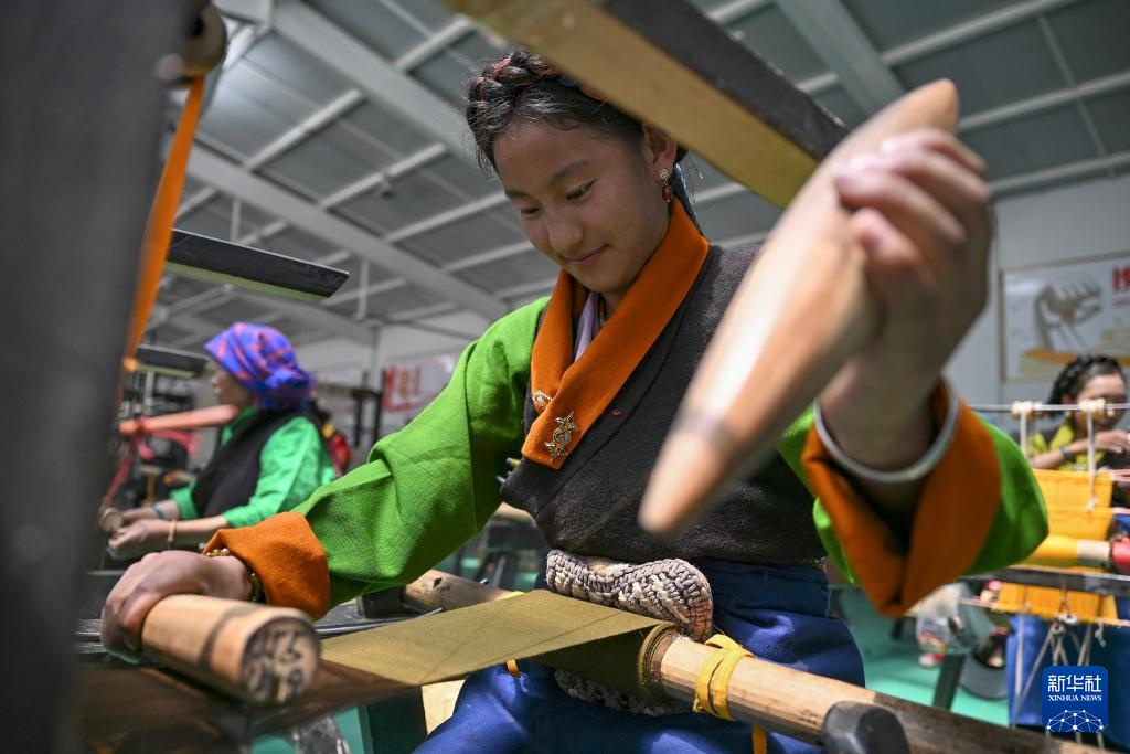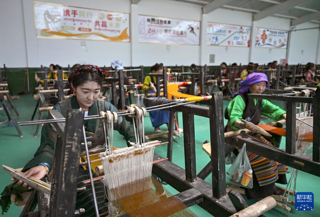 9月1日,在西藏日喀则市仁布县特色产业孵化园,亚德细褐羊毛织品农民专业合作社工作人员在车间里织布。