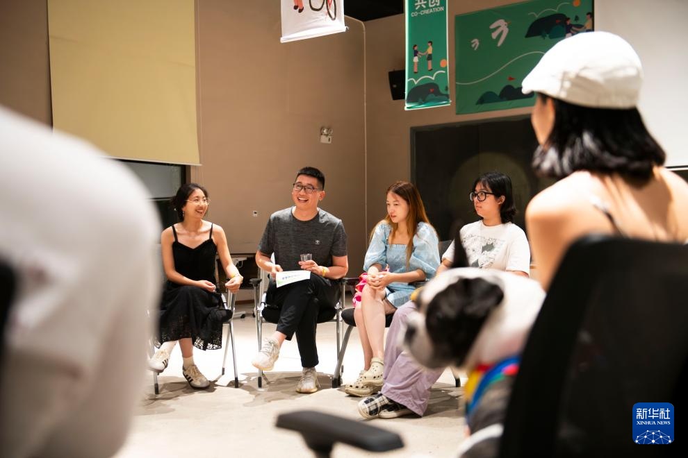 8月31日,在黄山市黟县的“黑多岛”社区,旅居青年与游客在灵感食堂活动中交流。