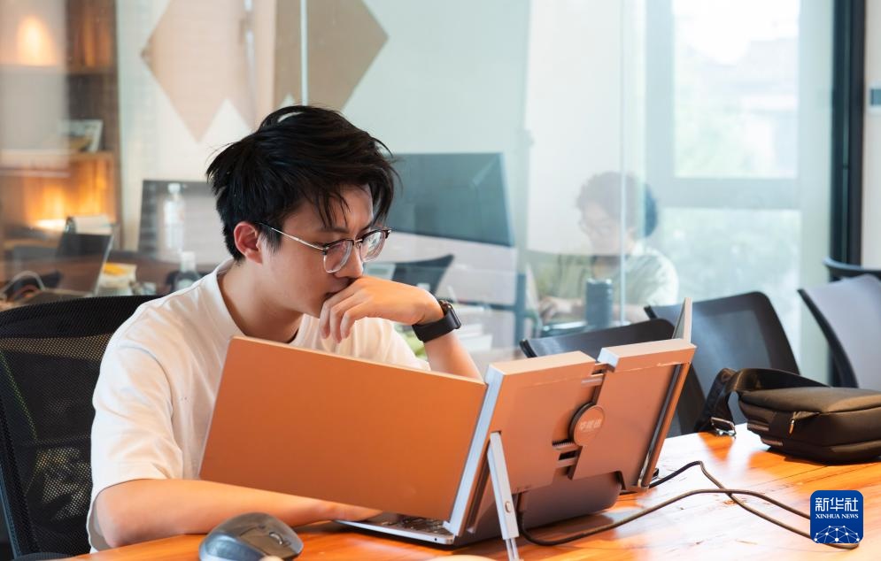 8月30日,在黄山市黟县的“黑多岛”社区,程序员梁凯文在共享办公区工作。