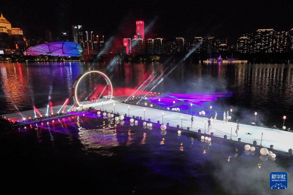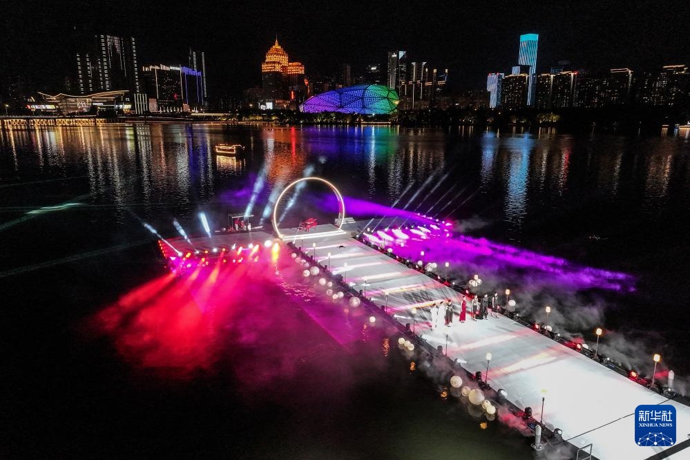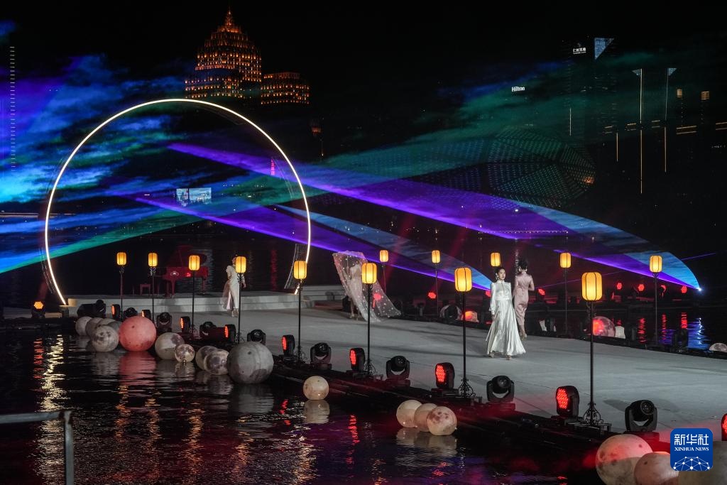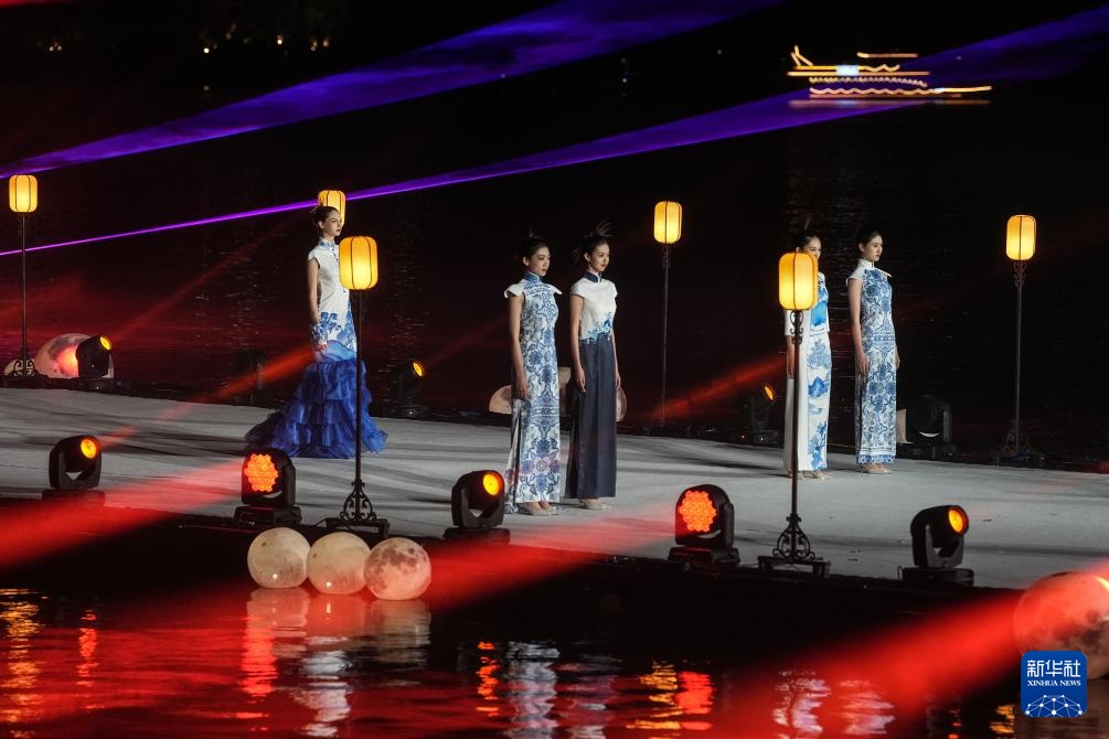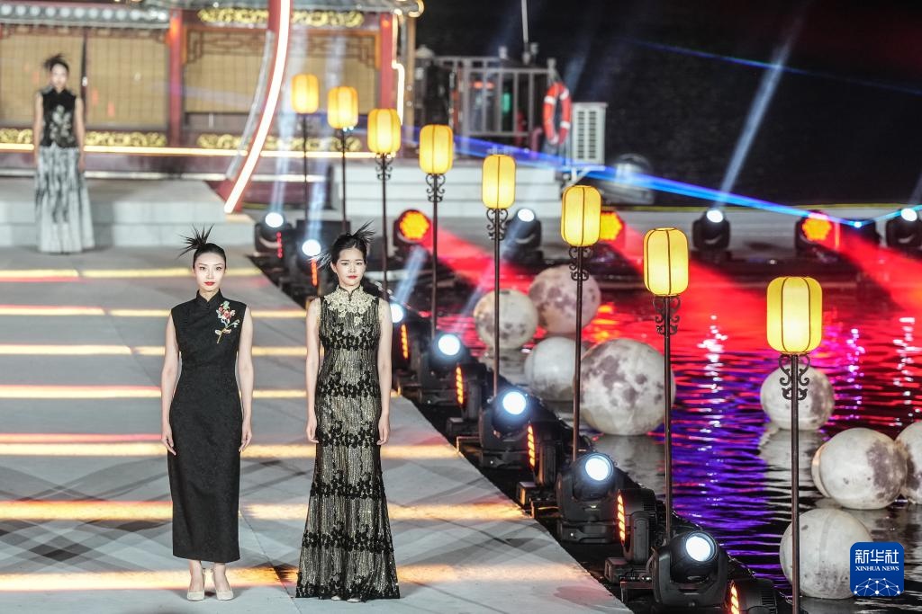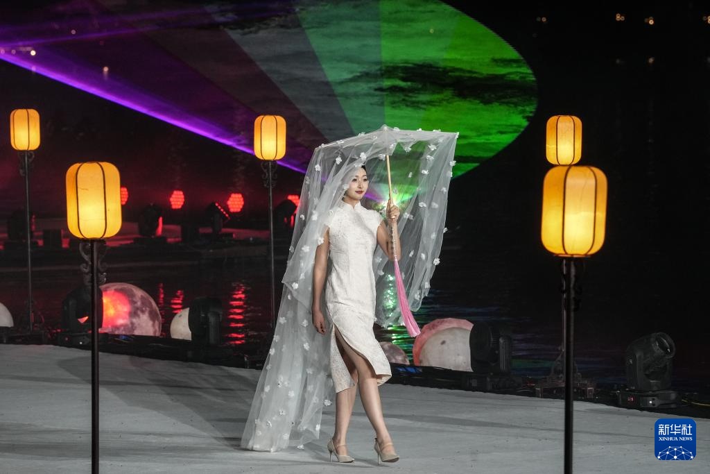 9月2日,模特在开幕式上进行旗袍走秀(无人机照片)。