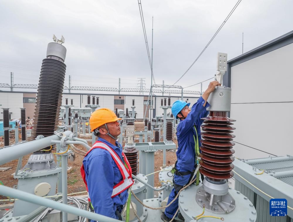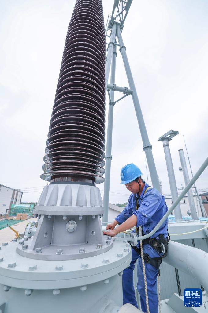9月3日,在500千伏长兴变变电站建设现场,国网浙江省电力有限公司的施工安装人员在145吨的变压器顶部进行附件安装。