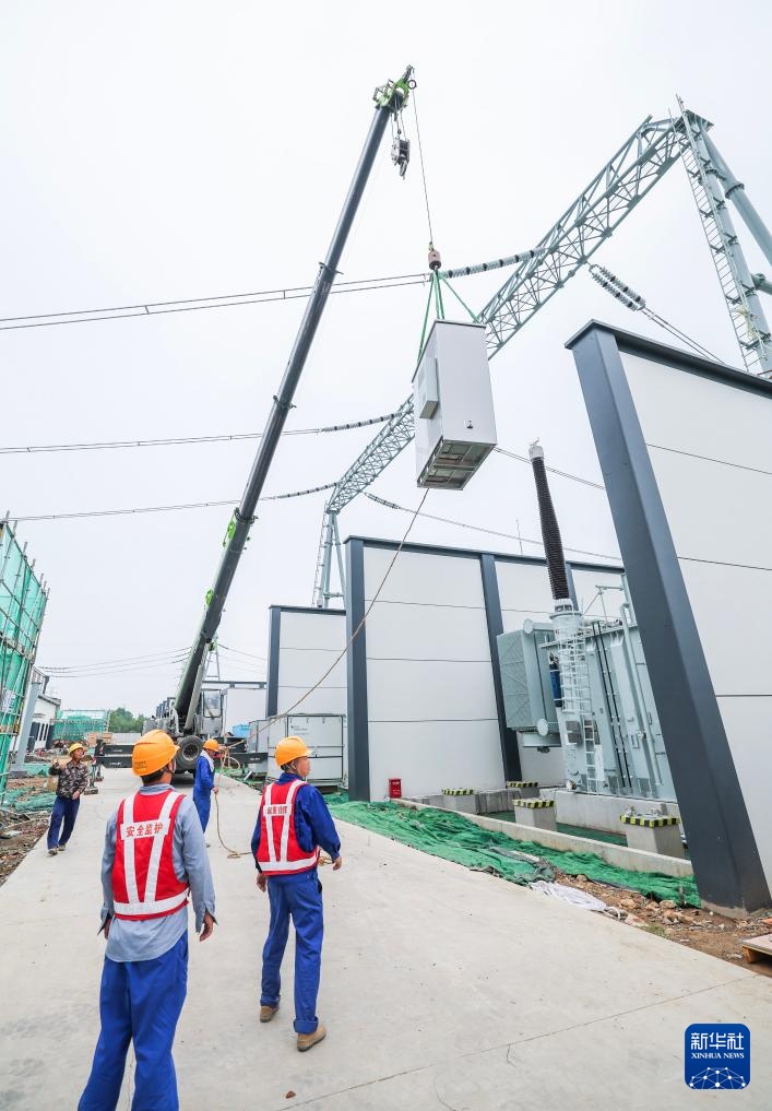 9月3日,500千伏长兴变变电站建设现场正在进行主变智能控制柜的吊装作业。