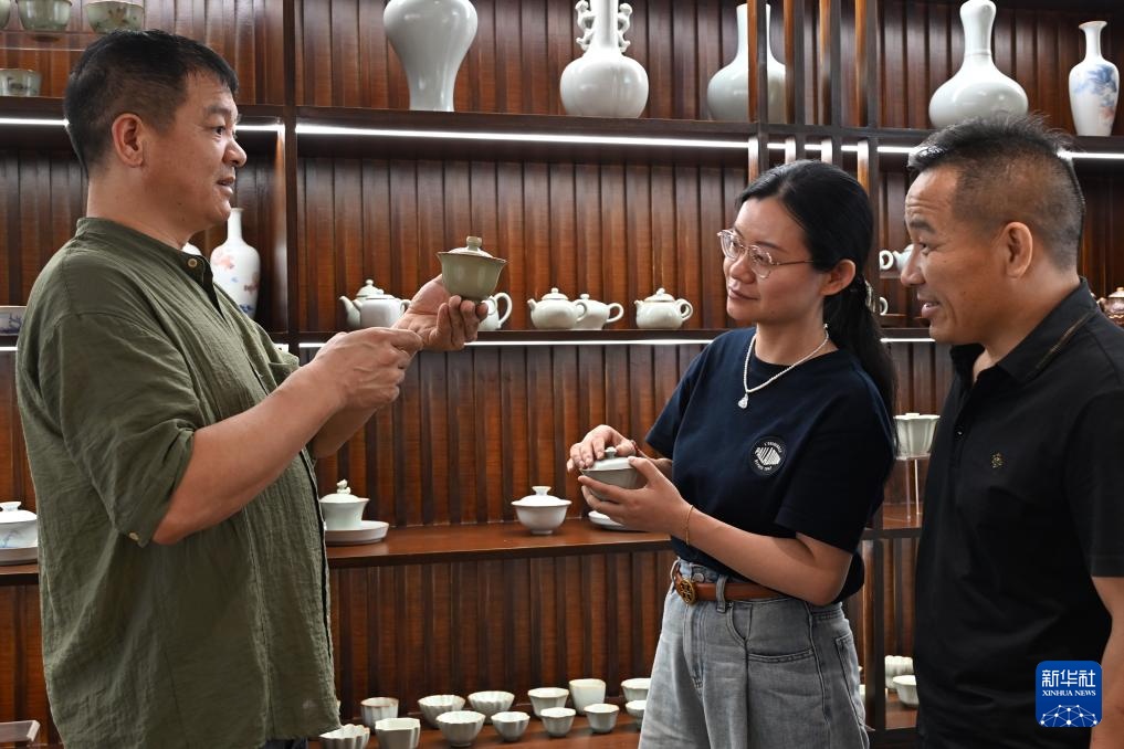 在善窑厂的车间里,匠人在对刚烧制出的汝瓷产品进行质量检测(8月28日摄)。