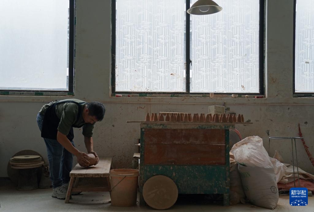 在位于江西省景德镇市善窑厂的车间里,李善明在揉捏瓷泥(8月28日摄)。