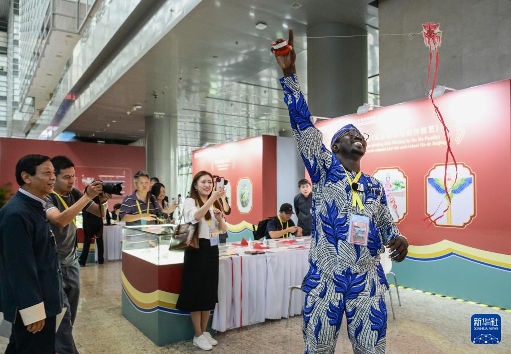 9月3日,一名非洲记者在2024年中非合作论坛峰会新闻中心放飞自己体验制作的中国传统风筝。
