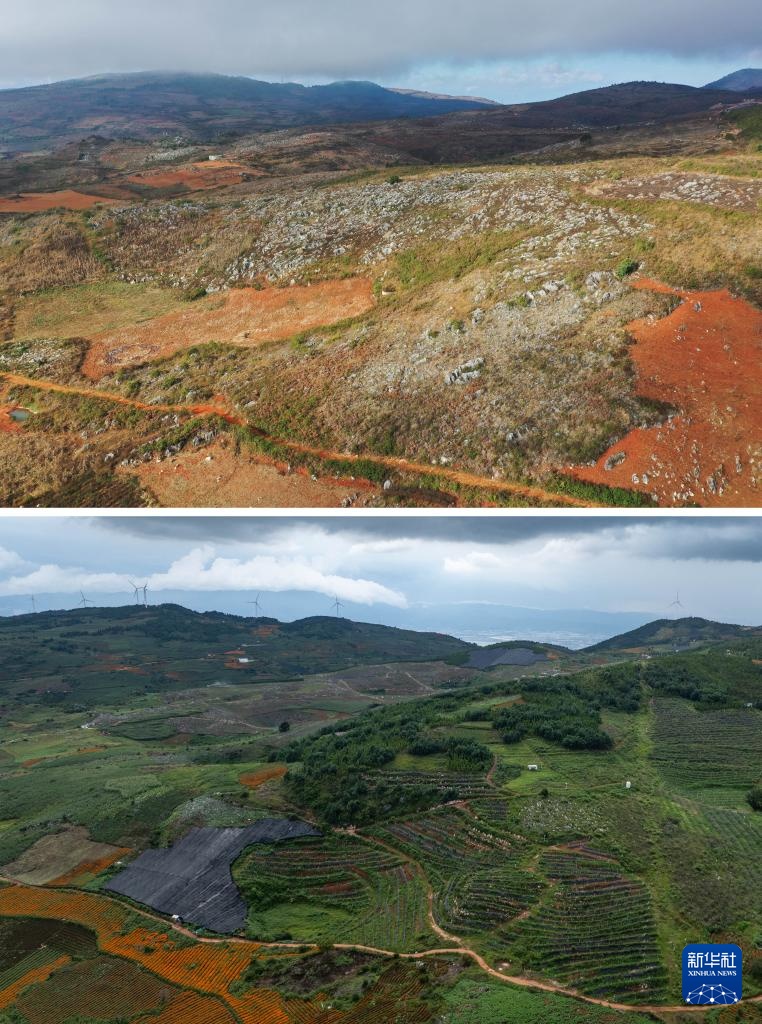 拼版照片,上图为:2019年1月拍摄的云南省红河州蒙自市西北勒乡一景(无人机照片,新华社发);下图为:2024年9月3日拍摄的云南省红河州蒙自市西北勒乡生态修复后的景象(无人机照片,新华社记者胡超摄)。