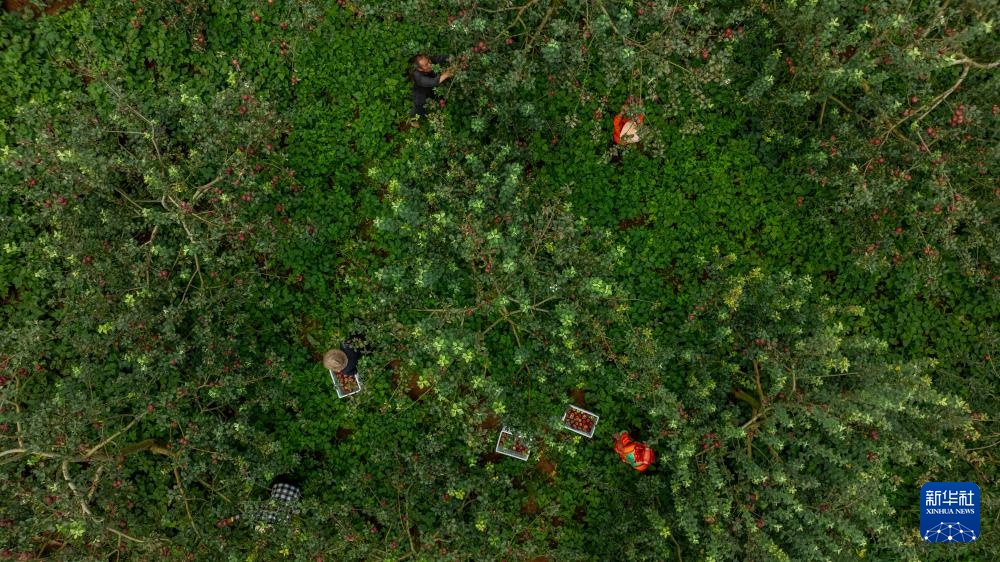 9月3日,云南省红河州蒙自市西北勒乡的农户在采摘苹果(无人机照片)。