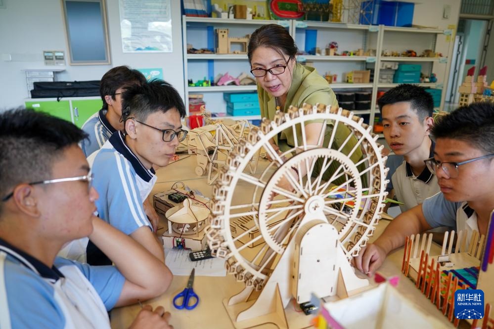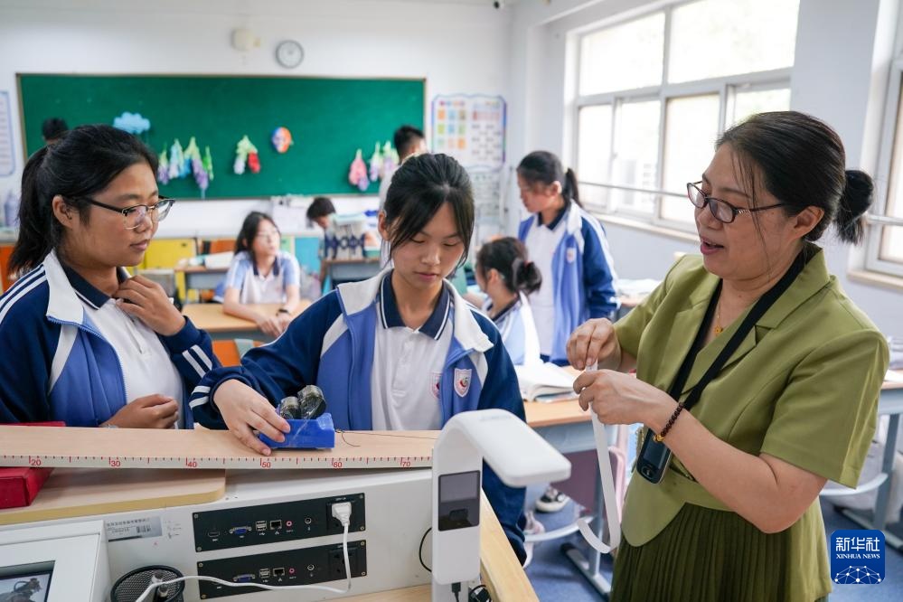 9月3日,在南京市聋人学校创客空间,史学军(右三)为学生上趣味物理实验课。新华社记者 李博 摄pagebreak