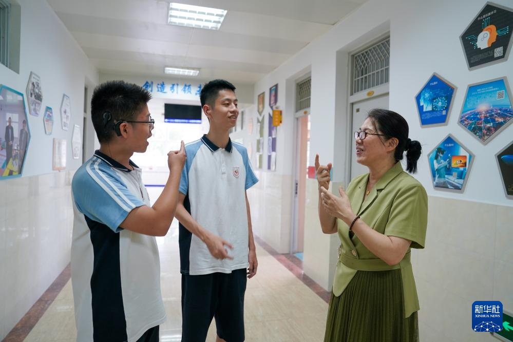 新学期开始,史学军(右一)和学生通过手语交流分享暑假生活(9月3日摄)。新华社记者 李博 摄pagebreak