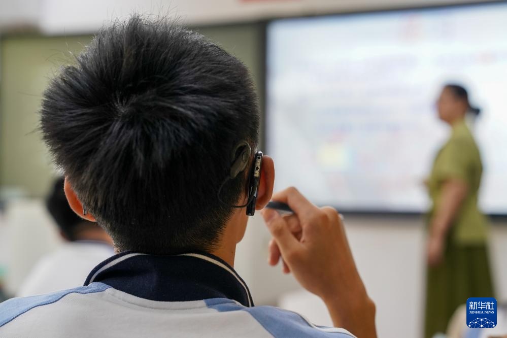 9月3日,在南京市聋人学校,一名佩戴电子耳蜗的同学在听史学军的物理课。新华社记者 李博 摄pagebreak