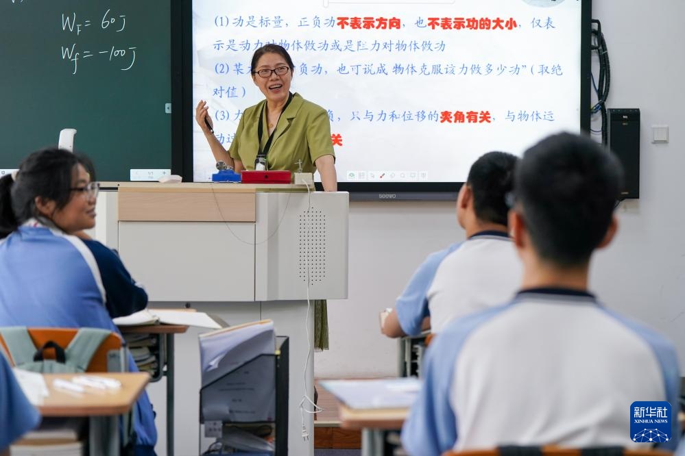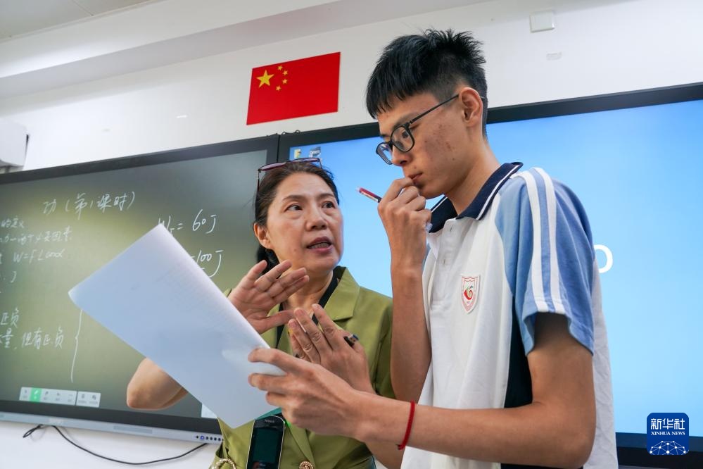 9月3日,在南京市聋人学校,史学军(左)为学生讲解物理习题。新华社记者 李博 摄