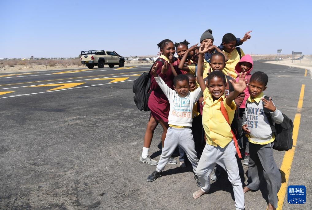 9月3日,在纳米比亚南部城镇策斯,孩子们在修复后的B1高速公路路段上合影。