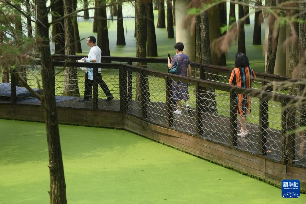 初秋时节,杭州青山湖水上森林近百亩池杉、落羽杉和水面的浮萍相映成趣,呈现出幽静的生态景观。
