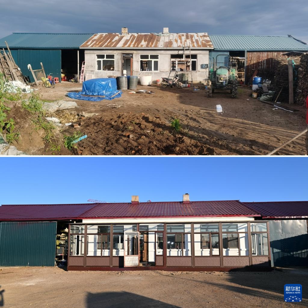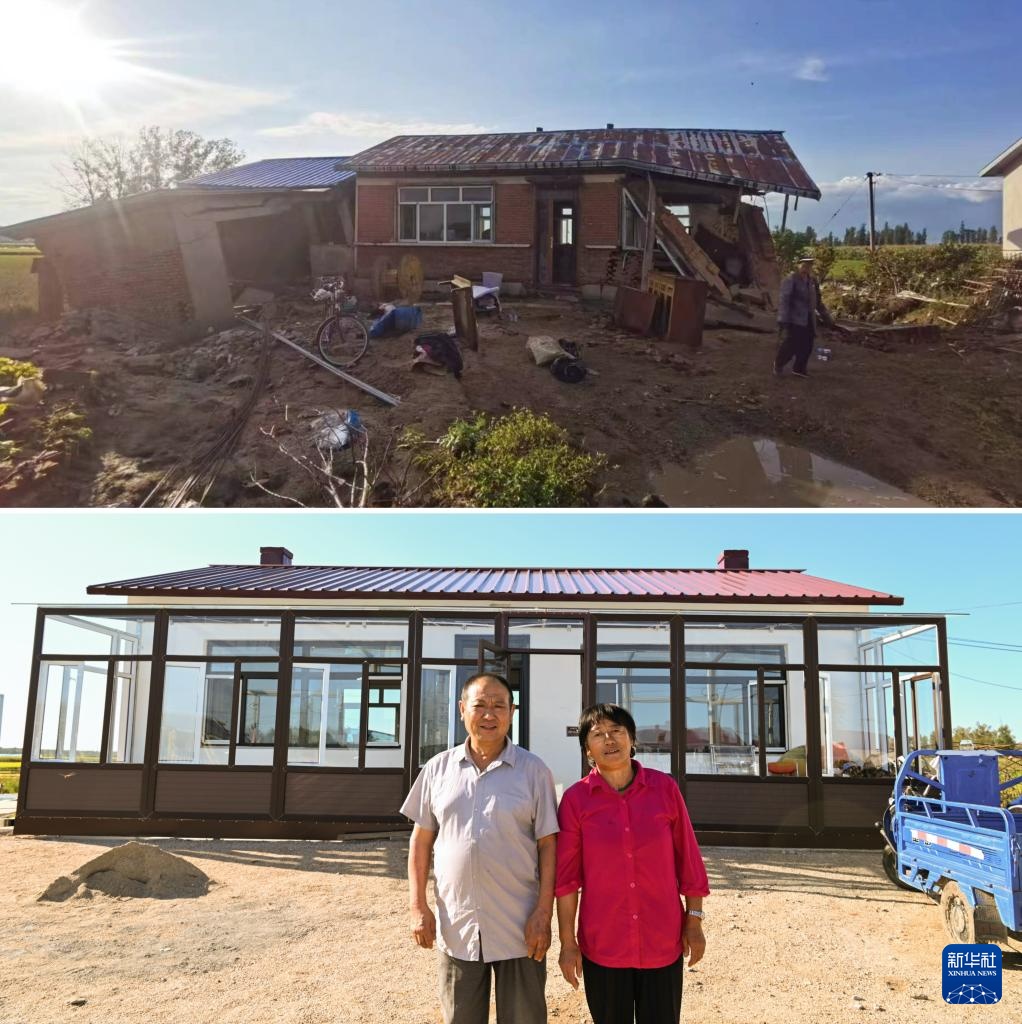 拼版照片:上图为2023年8月31日拍摄的龙王庙村村民杨春贵家遭受洪涝灾害的房屋(新华社发任春燕摄);下图2024年9月3日拍摄的杨春贵家重建的房屋(新华社记者王松摄)。