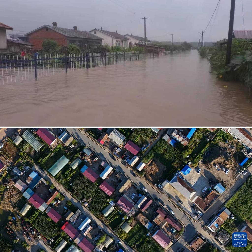 拼版照片:上图为2023年8月3日拍摄的遭受洪涝灾害的龙王庙村(新华社发王国辰摄);下图为2024年9月3日拍摄的龙王庙村新貌(无人机照片,新华社记者王松摄)。