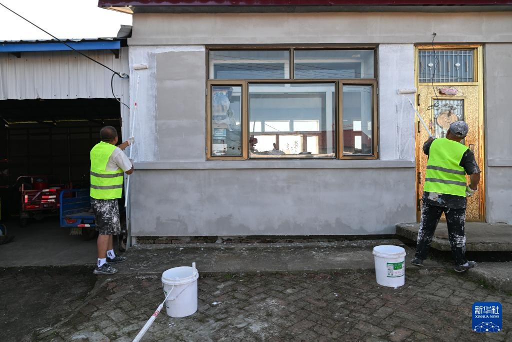 工人在为龙王庙村重建的房屋刷墙(9月3日摄)。