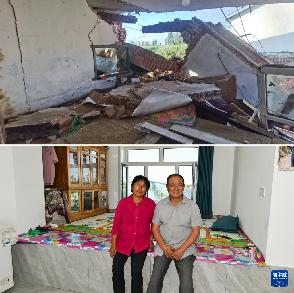 拼版照片:上图为2023年8月5日拍摄的龙王庙村村民赵志山与车喜华夫妇遭受洪涝灾害的房屋(新华社发任春燕摄);下图为2024年9月3日,赵志山与车喜华夫妇在新建成的房屋内合影(新华社记者王松摄)。