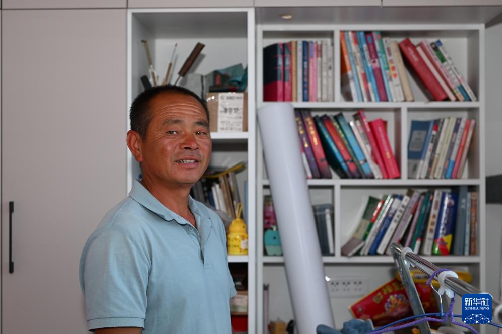龙王庙村村民杨春贵在重建的房屋中接受采访(9月3日摄)。