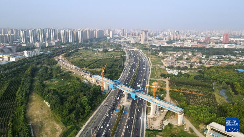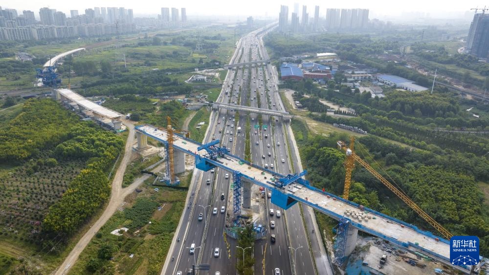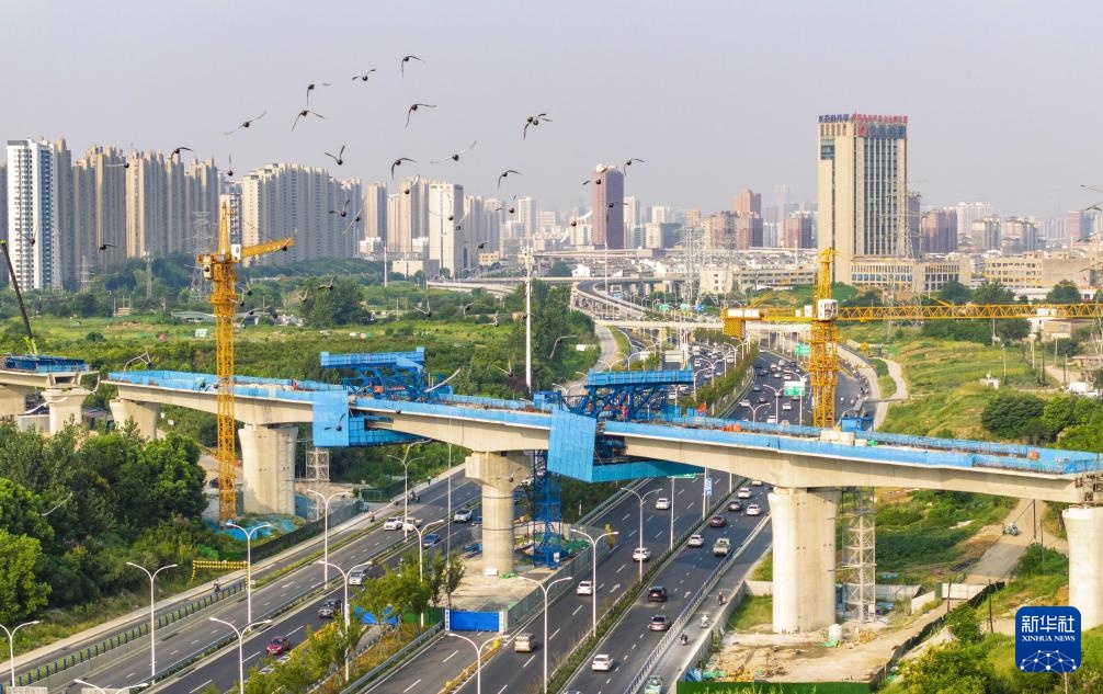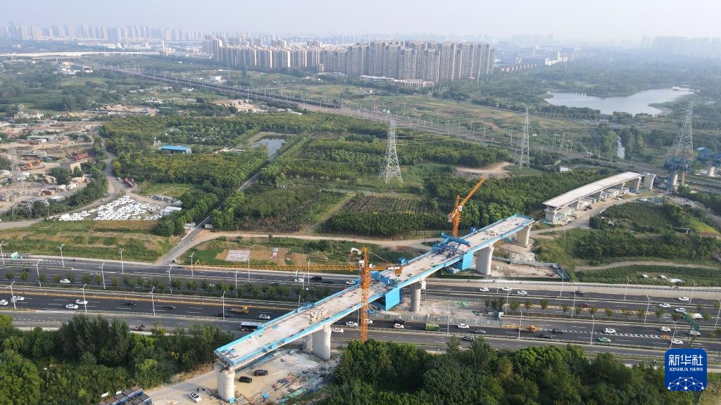 这是合安铁路引入合肥枢纽跨包公大道特大桥合龙现场(9月4日摄,无人机照片)。