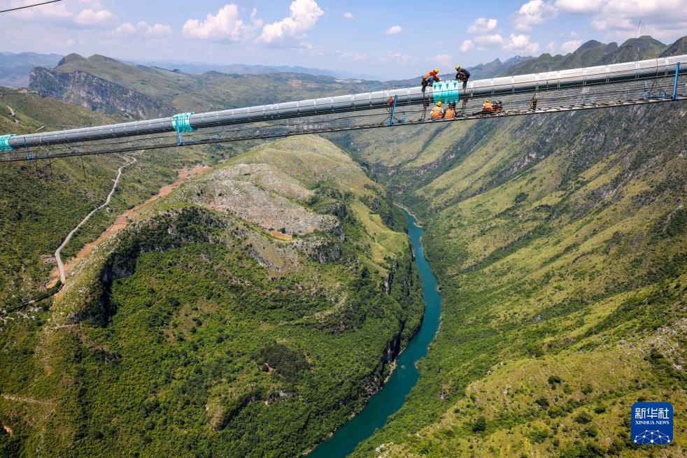 9月4日,建筑工人在花江峡谷大桥的猫道上施工。