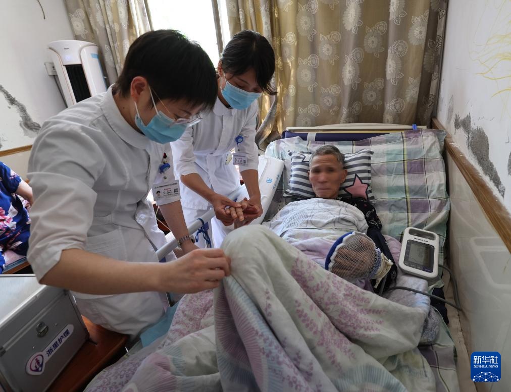 9月5日,绍兴越城区鉴湖街道社区卫生服务中心的医护人员到街道养老中心为卧床老人进行日常巡诊。