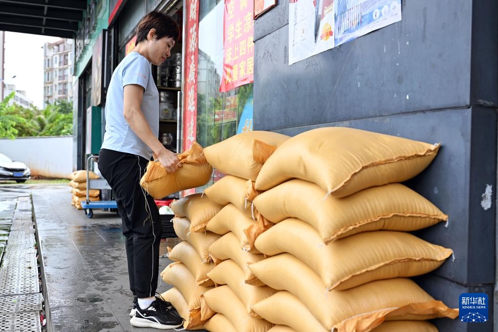 9月5日,海口市一家商户的店员在准备防水沙袋。